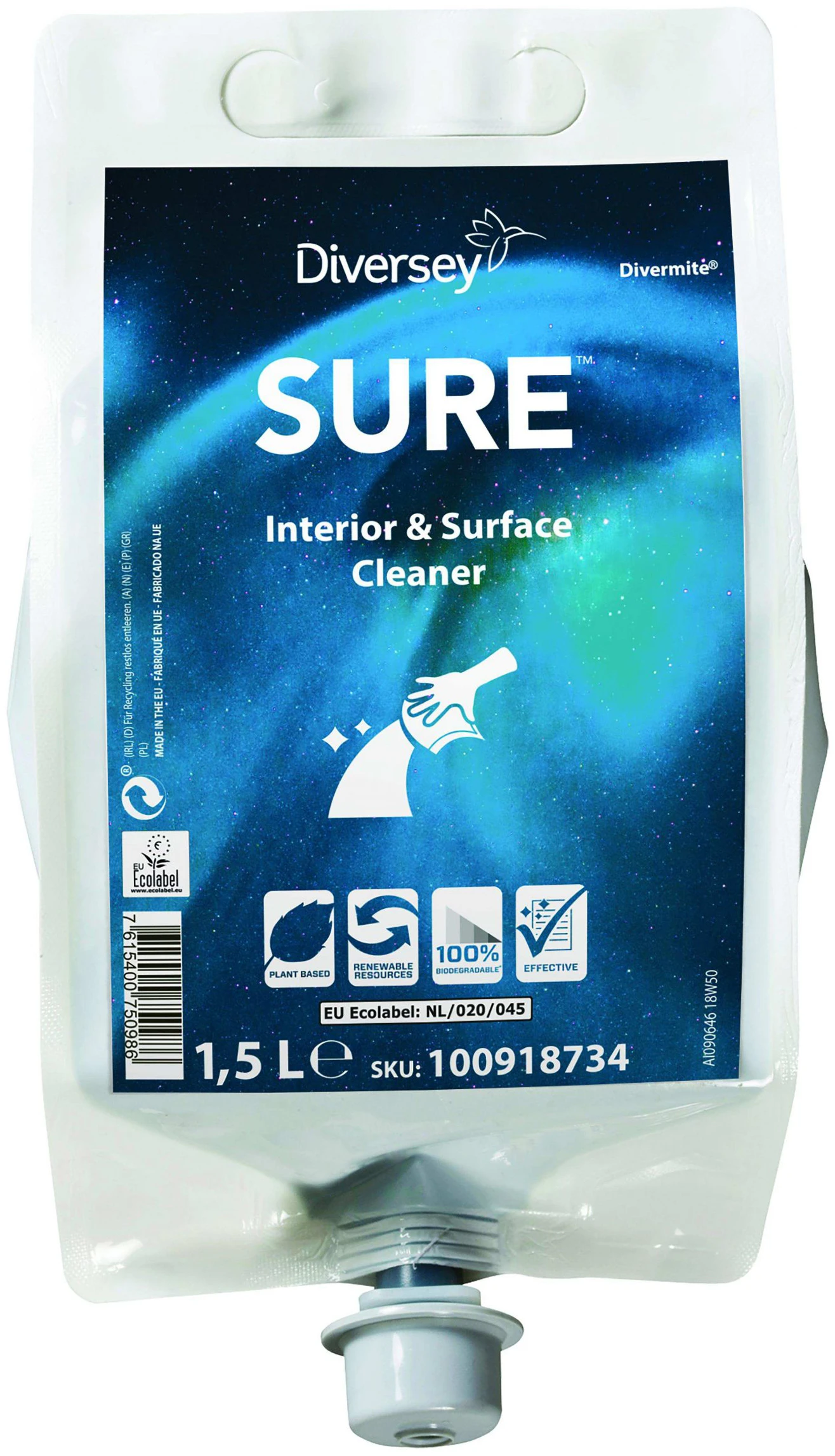 SURE Interior & Surface Cleaner is een geconcentreerd reinigingsmiddel voor gebruik op harde oppervlakken, zoals vloeren, muren, deuren, plafonds en overige oppervlakken.